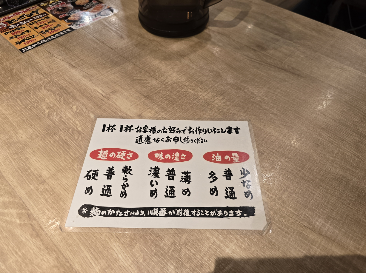 그리고 어느 라멘가게를 가도 면 익힘정도, 국물 진함정도, 기름 양을 선택하는데요.