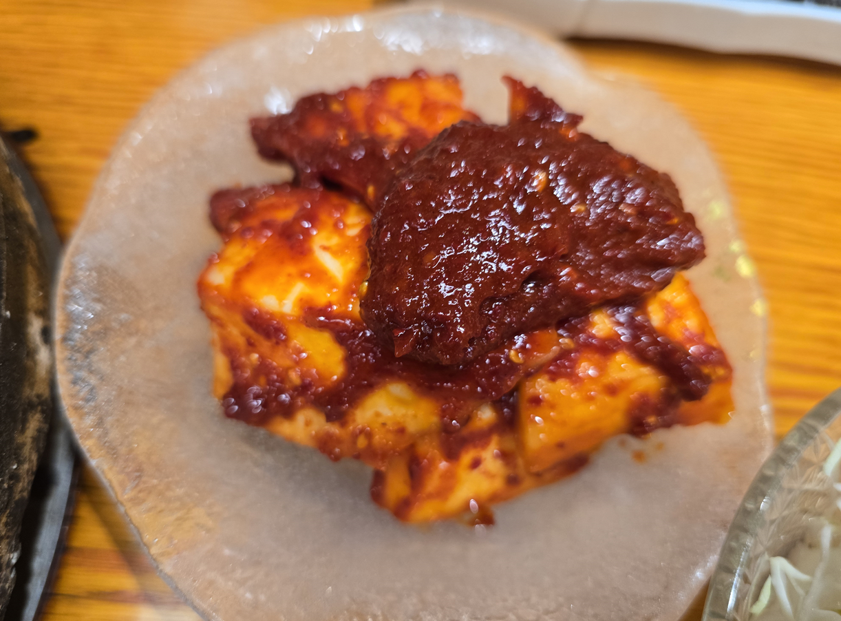 테이블 옆에 있는 소스와 같이 먹으면 맛있어요.